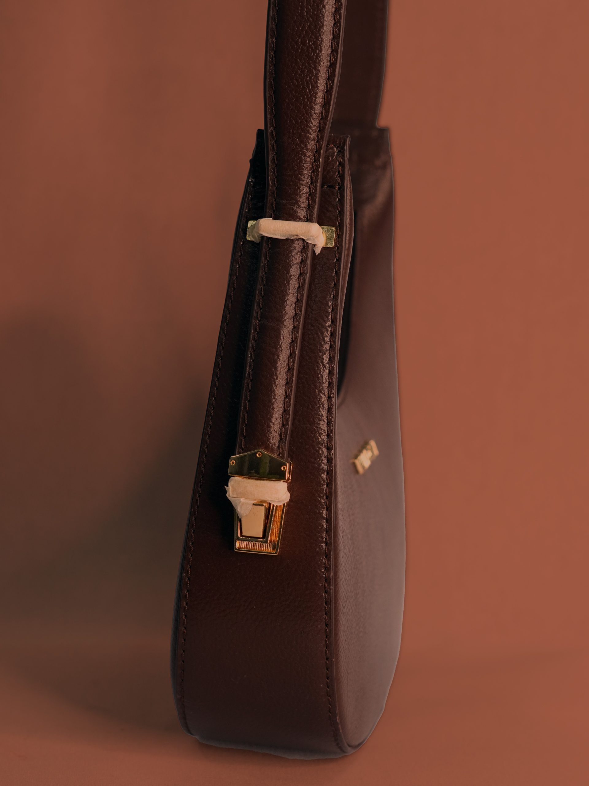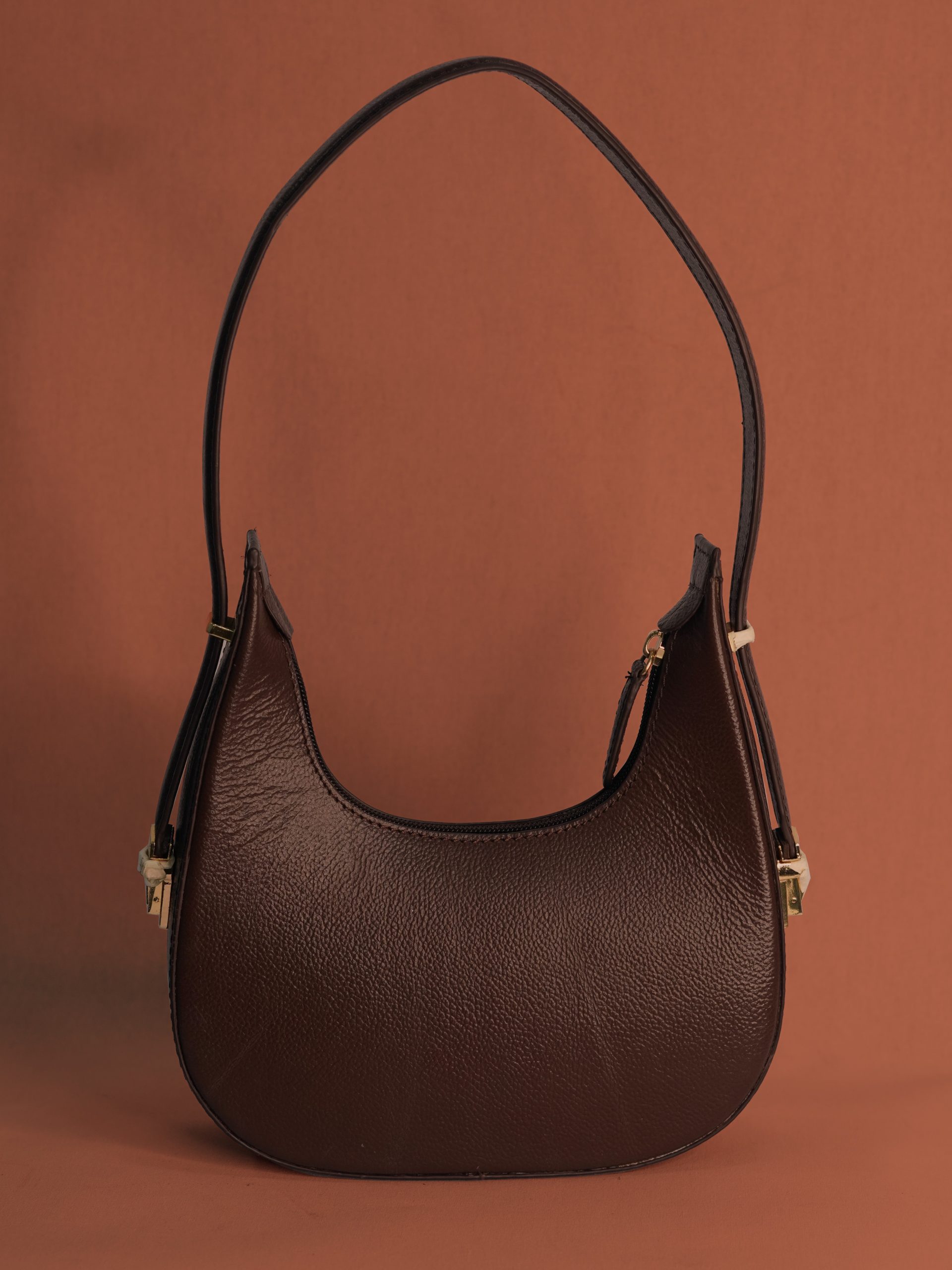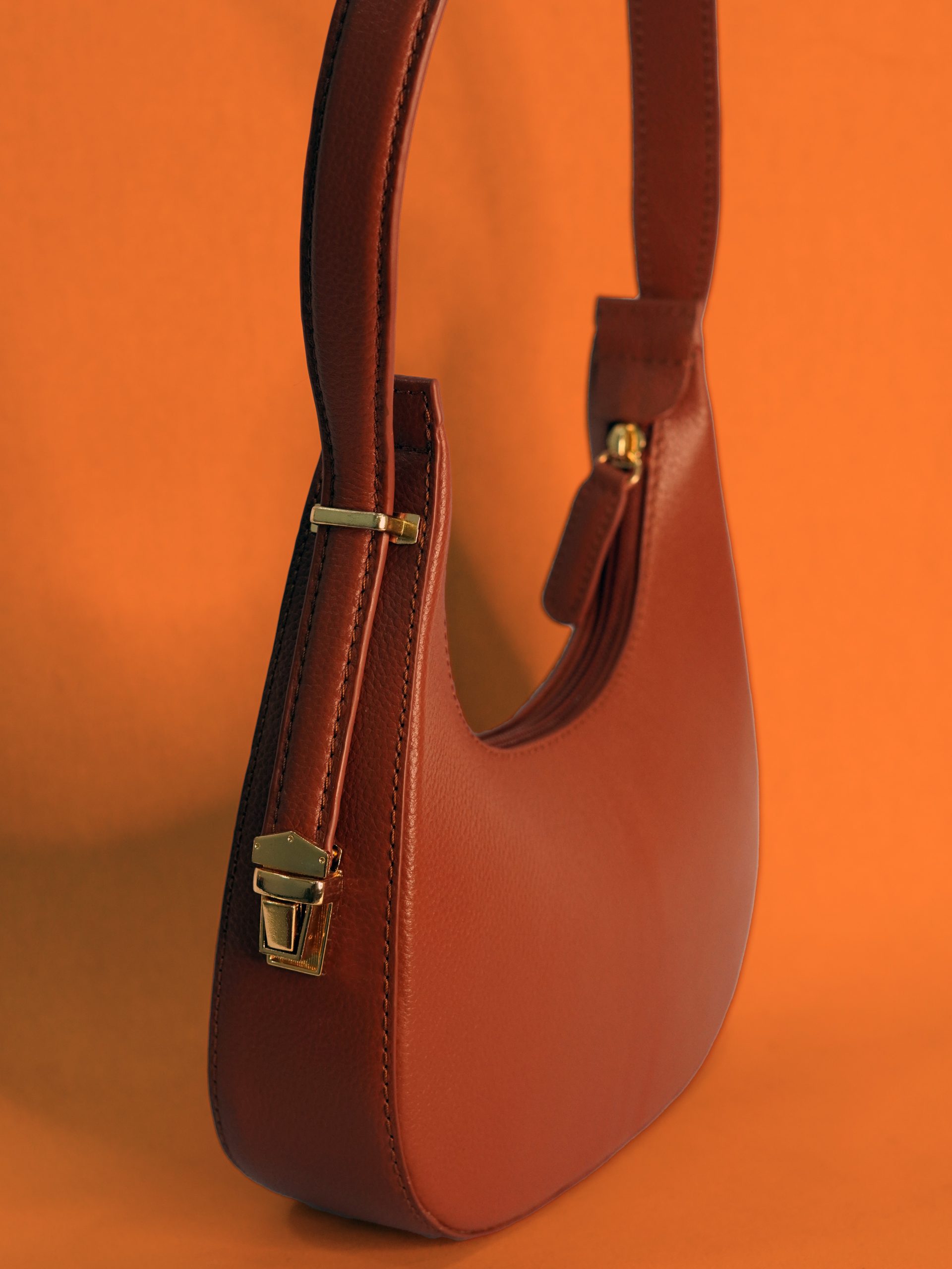 Strap: Single, fixed-length leather shoulder strap.